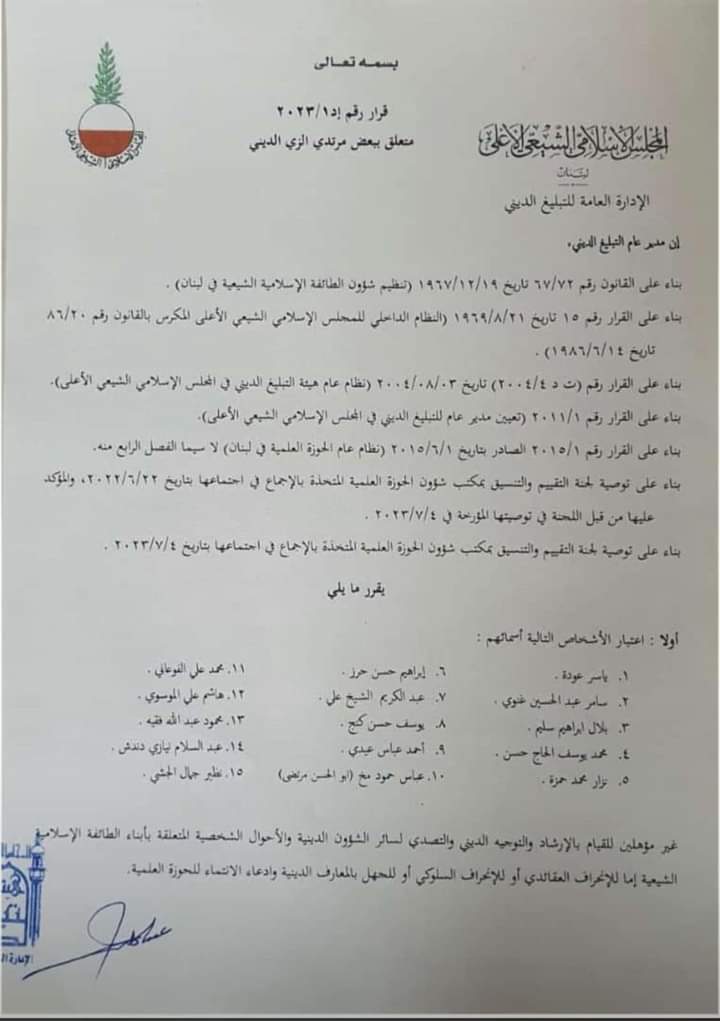 اعلن المجلس الاسلامي الشيعي الاعلى – هيئة التبليغ الديني في بيان، ان “الادارة العامة للتبليغ الديني صدرت قرارا حمل الرقم إد1/2023 يتعلق ببعض مرتدي الزي الديني ، جاء فيه: “إن مدير عام التبليغ الديني، بناء على توصية لجنة التقييم والتنسيق بمكتب شؤون الحوزة العلمية المتخذة بالإجماع في اجتماعها بتاريخ 22/6/2022، والمؤكد عليها من قبل اللجنة في توصيتها المؤرخة في 4/7/2023 . وبناء على توصية لجنة التقييم والتنسيق بمكتب شؤون الحوزة العلمية المتخذة بالإجماع في اجتماعها بتاريخ 4/7/2023 ، يقرر ما يلي: