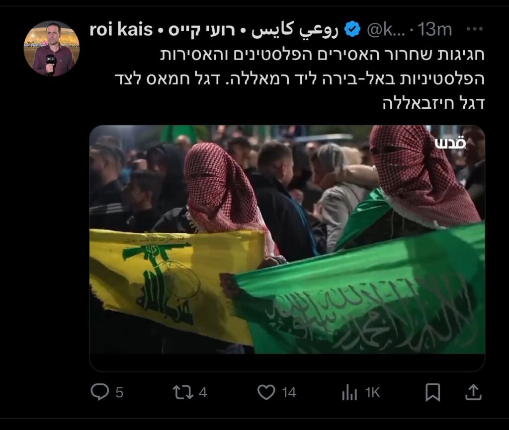 علق محرر الشؤون العربية في قناة كان روعي قيس على صورة رفع فيها راية حزب الله في الضفة فقال :