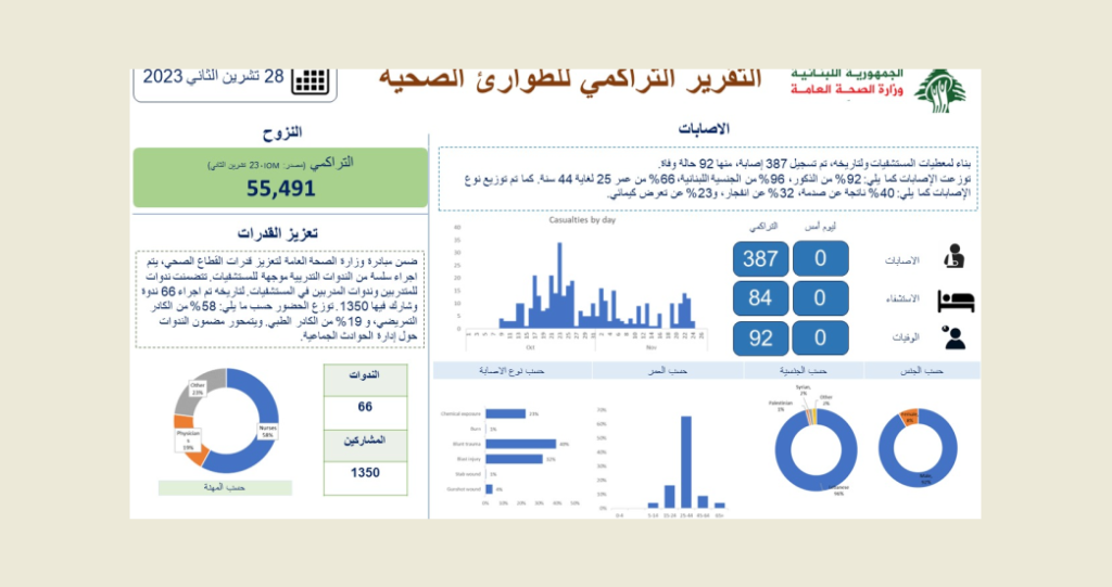 شاركها فيسبوك تويتر لينكدإن بينتيريست البريد الإلكتروني وزارة الصحة تنشر التقرير التراكمي للطوارئ الصحية نشرت وزارة الصحة العامة متابعة للعدوان الاسرائيلي على جنوب لبنان، التقرير التراكمي للطوارئ الصحية ل ٢٨ تشرين الثاني 2023. وزارة الصحة