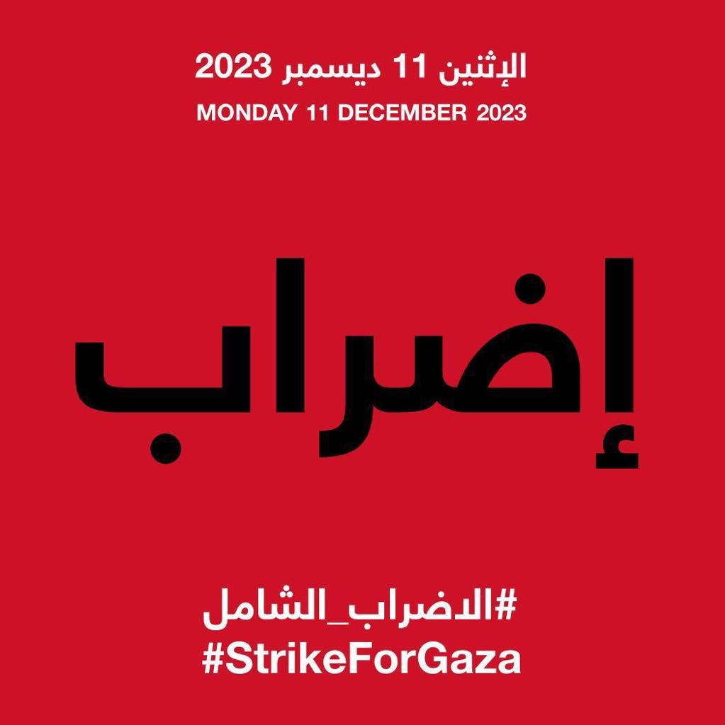 بعد مرور أكثر من شهرين على بدء العدو الإسرائيلي حربه ضد قطاع غزة ومع بلوغ عدد الشهداء 17 ألفًا و487 فلسطينيًا وعدد الجرحى 46 ألفًا و480 مصابًا تداعى ناشطون وحقوقيون وإعلاميون وأكاديميون من مختلف أنحاء العالم إلى إعلان الإضراب يوم غد الإثنين الواقع فيه 11 كانون الأول 2023.
