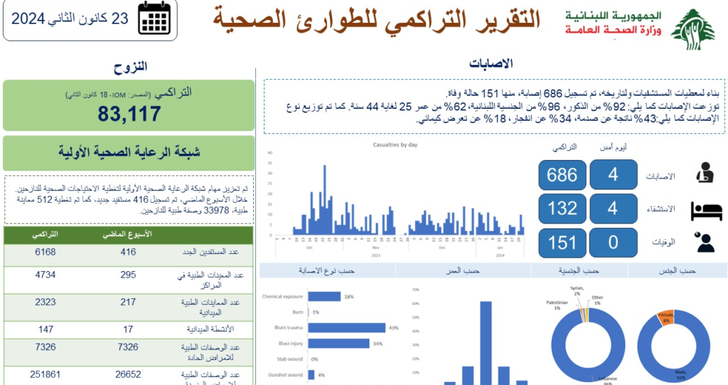 شاركها فيسبوك تويتر لينكدإن بينتيريست البريد الإلكتروني وزارة الصحة العامة تنشر التقرير التراكمي للطوارئ الصحية نشرت وزارة الصحة العامة، متابعةً للعدوان الاسرائيلي على جنوب لبنان، التقرير التراكمي للطوارئ الصحية ل٢٣ كانون الثاني ٢٠٢٤. وزارة الصحة