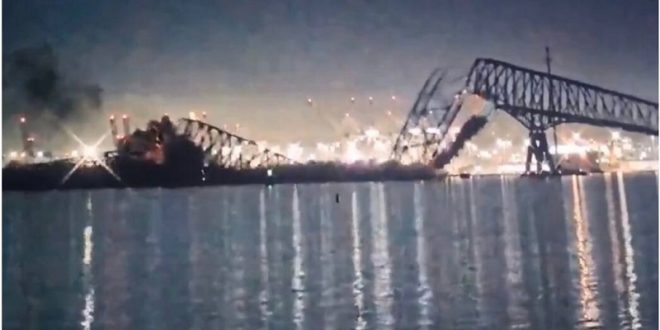 انهار جسر “فرانسيس سكوت كي” بمدينة بالتيمور الأميركية في ساعة مبكرة، بعد اصطدام سفينة كبيرة به، بحسب ما ذكرت وسائل إعلام أميركية.