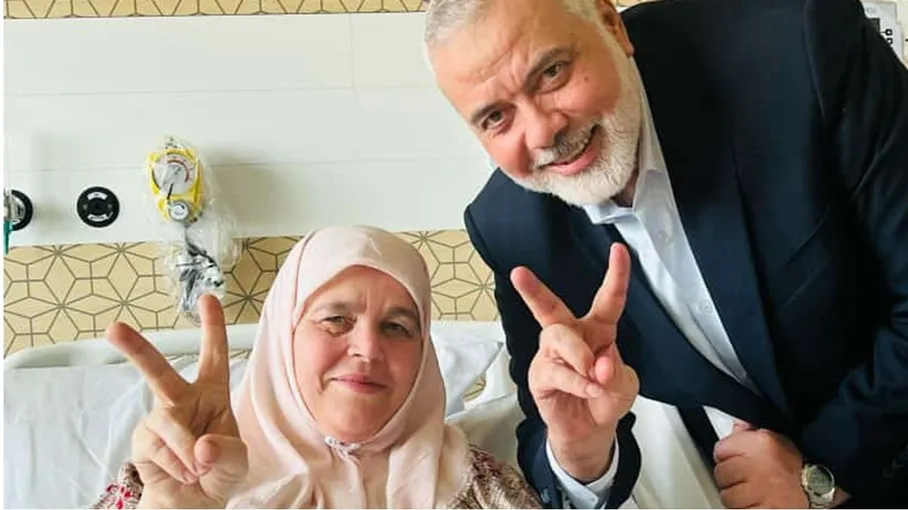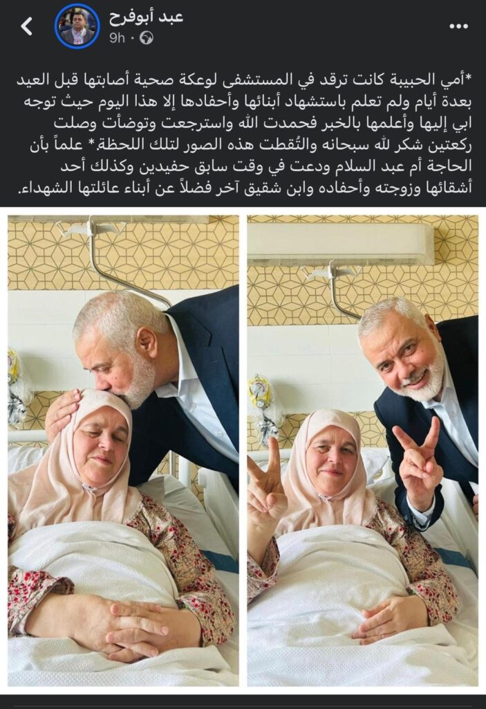 نشر عبد السلام هنية، النجل الأكبر لرئيس المكتب السياسي لحركة حماس إسماعيل هنية، صورة لوالدته لحظة تلقيها خبر استشهاد أبنائها الثلاثة في قطاع غزة.