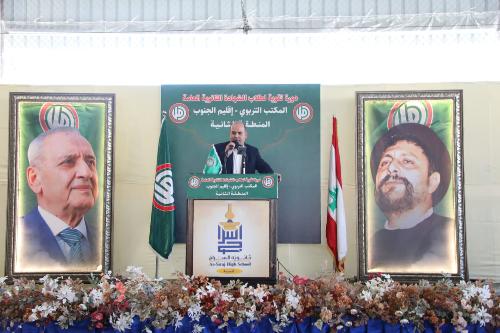 برعاية عضو كتلة “التنمية والتحرير” النائب ناصر جابر ممثلاً بمدير مكتبه الأستاذ محمد حجازي، افتتح المكتب التربوي في حركة امل /اقليم الجنوب/المنطقة الثانية دورة التقوية لطلاب شهادة الثانوية العامة والتي ينظّمها في ثانوية السراج- القصيبة، بحضور المسؤول التربوي لاقليم الجنوب الدكتور عباس مغربل، المسؤول التنظيمي للمنطقة الثانية الدكتور أحمد صفاوي، عضو المجلس الإستشاري في حركة أمل ومدير عام مؤسسات السراج الأستاذ الحاج عباس عباس، الشعب الحركية في المناطق، مديري الثانويات والمدارس الرسمية والخاصة في المنطقة، رؤساء البلديات وفعاليات تربوية وإجتماعية وأهلية، طلاب شهادة الثانوية العامة في المنطقة..