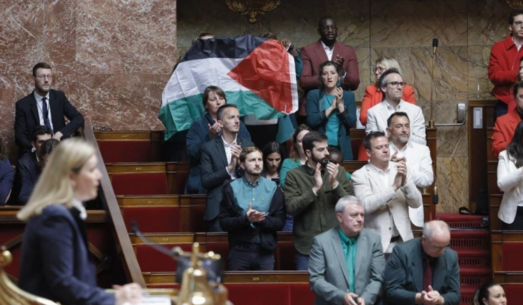 شكل نواب من اليسار في البرلمان الفرنسي خلال جلسة اليوم العلم الفلسطيني، وذلك على خلفية إنزال أقصى عقوبة على البرلماني سيباستيان ديلوغو لحمله علم فلسطين في الجمعية الوطنية.