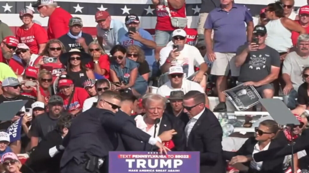ووثق مقطع فيديو لحظة محاولة اغتيال ترامب بعد لحظات من اعتلائه المنصة خلال تجمع انتخابي ببنسلفانيا، حيث اصطحبه جهاز الخدمة السرية والدماء تسيل من جانب وجهه.