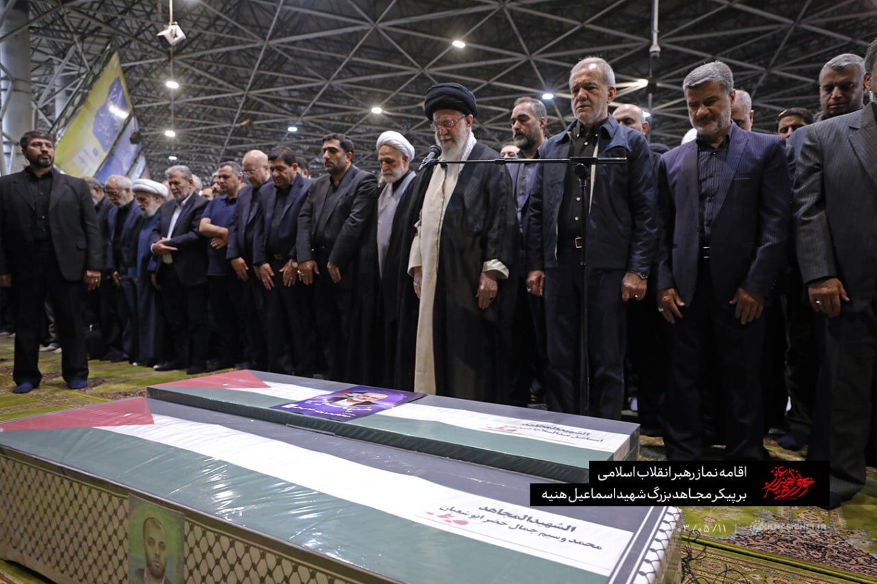 وفي جامعة طهران، أمّ المرشد الأعلى للجمهورية الإسلامية آية الله علي خامنئي المصلّين في جنازة هنية الذي سيدفن الجمعة في قطر.