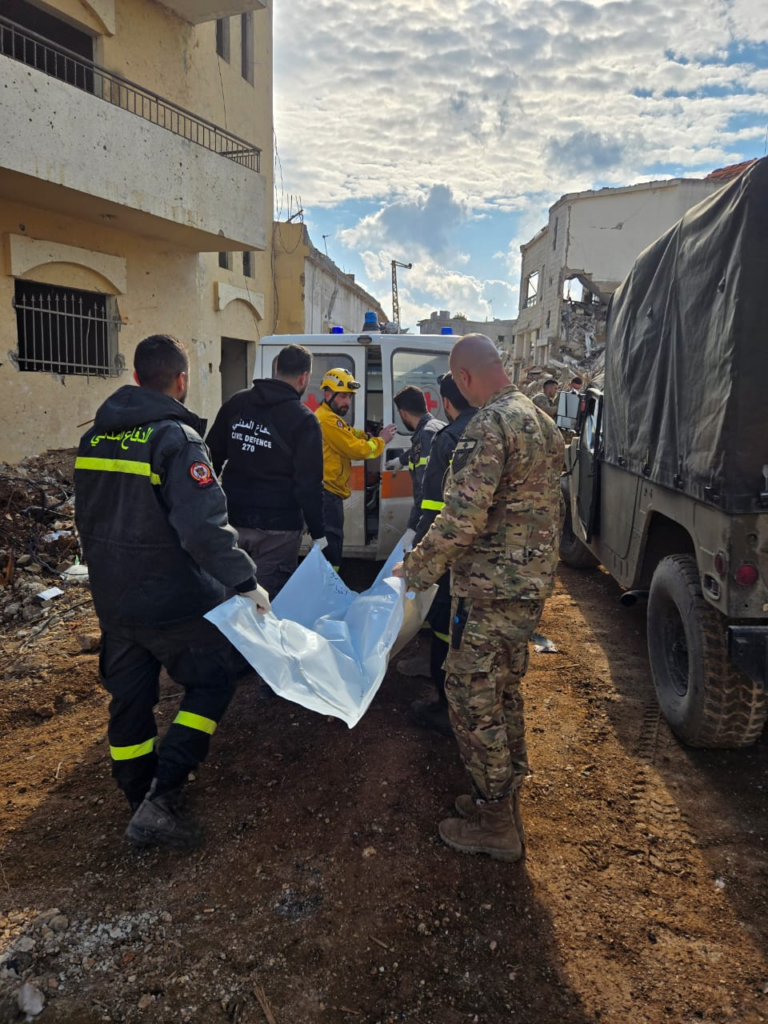 وفي بلدة طيرحرفا، انتشل عناصر الدفاع المدني جثمان شهيد.