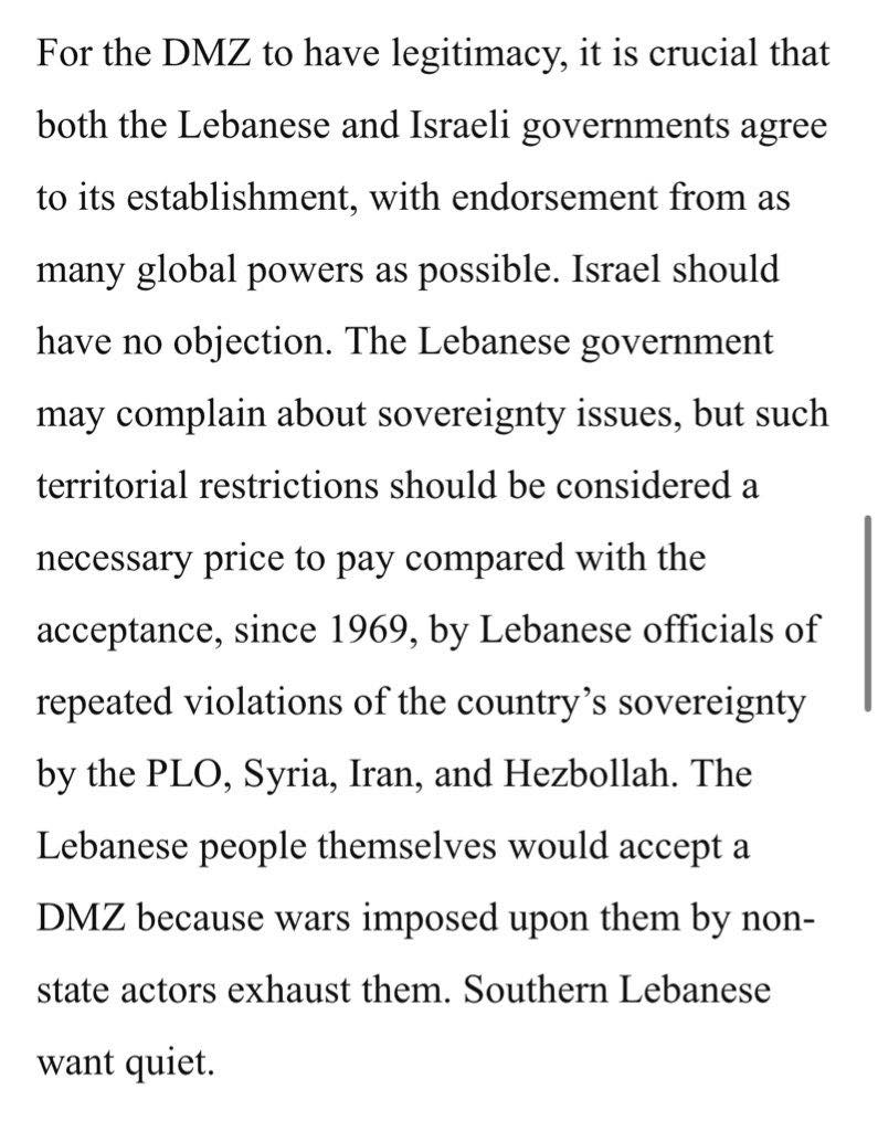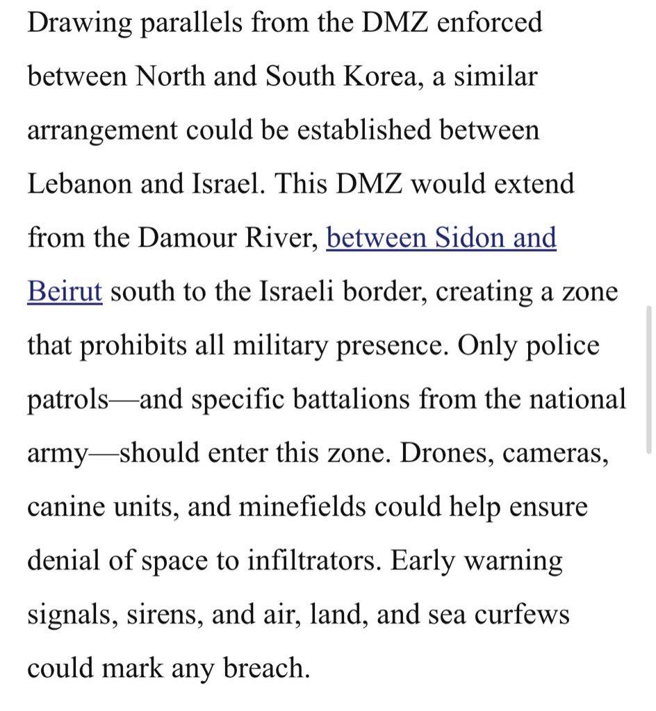 بعد أسبوع واحد على اندلاع الحرب الكبرى في جنوب لبنان، كتب كريم سعيد الذي عُيِّن قبل أيام حاكمًا لمصرف لبنان مقالًا (بتاريخ 30 أيلول 2024) يقترح فيه إقامة منطقة منزوعة السلاح تمتد من نهر الدامور حتى الحدود مع فلسطين المحتلة. أي عمليًا: نصف لبنان خارج السيادة، وخاضع لمنظومة أمنية خارجية تُدار بالكاميرات، والطائرات المسيّرة، والكلاب البوليسية، مع استبدال الجيش اللبناني بدور للشرطة ومنع تواجد مسلح وحقيقي له في المنطقة، وإفراغ المنطقة من أي سلاح.