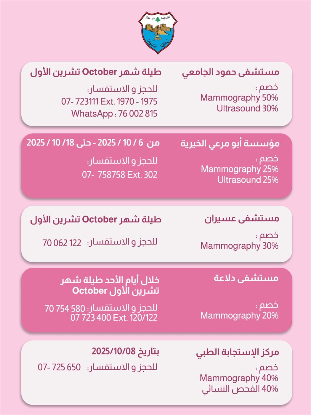 شاركها فيسبوك تويتر لينكدإن بينتيريست البريد الإلكتروني مع حلول شهر أكتوبر ، شهر التوعية بسرطان الثدي، تنظّم بلدية صيدا حملة طبيّة بالتعاون مع مراكز طبية عدة في المدينة، تتضمن حسومات خاصة على الفحوصات الخاصة بهذا الشهر.