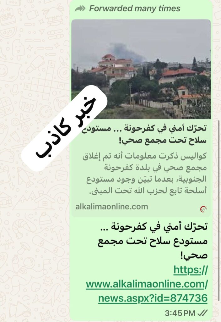 كما تشدّد البلدية على أنّ أي ضرر يلحق بالبلدة أو بأهلها نتيجة نشر هذه الأكاذيب، سيقع على عاتق صاحب الموقع والناشرين عليه، مع احتفاظ البلدية بحقّها القانوني الكامل في ملاحقة كل من يروّج أو ينشر أخبارًا كاذبة تمسّ سمعة البلدة وأهلها.