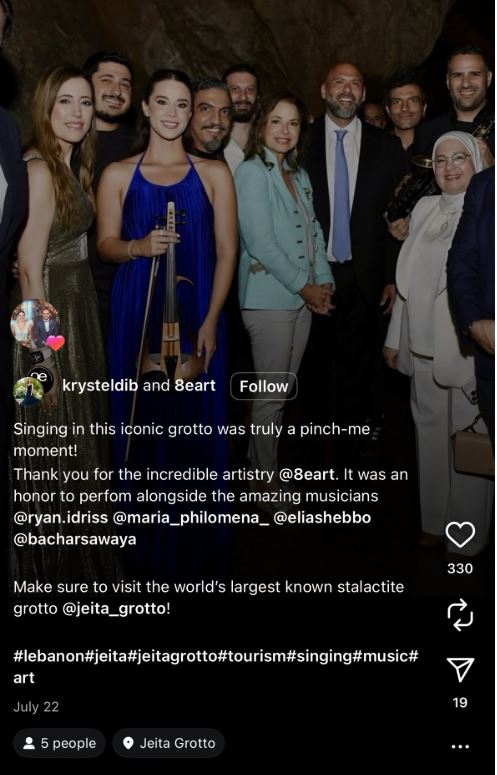 كتب الاعلامي جيمي فرانسيس عبر منصة “فايسبوك”: “تتوالى المفاجآت في ملف الحفل الذي أقيم داخل مغارة جعيتا وأثار جدلاً واسعاً، بعد محاولة وزيرة السياحة لورا لحود الخازن التنصل من مسؤوليتها وإلقاء اللوم على بلدية جعيتا، بحجة أن الحفل لم يحصل على إذن خطي من الوزارة، وأن ما جرى قد يضرّ بالمغارة، غير أن صوراً منشورة على حساب maria_philomena_ على موقع إنستغرام، بتاريخ 22 تموز 2025، تكشف مشاركة الوزيرة شخصياً في حفل موسيقي داخل مغارة جعيتا لا يختلف بالشكل والمضمون كثيراً عن حفل الزفاف الذي تبرأت منه مؤخراً”.