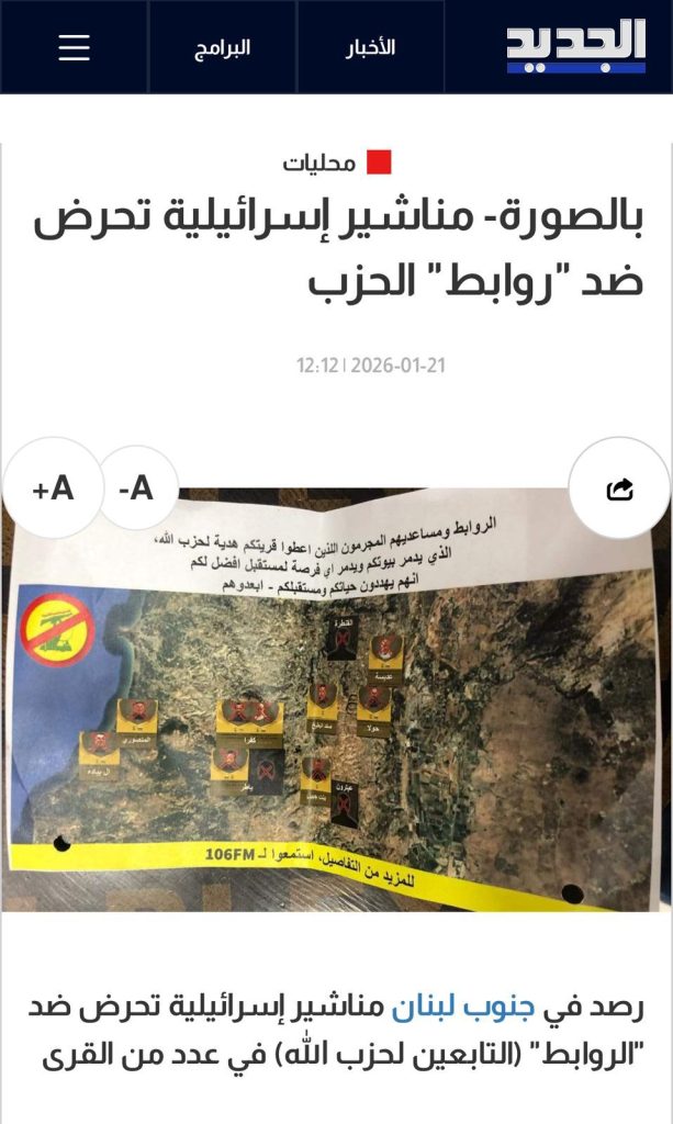 نشرت قناة “الجديد” صورة زعمت أنها تُظهر مناشير إسرائيلية تحريضية ضد ما سمّتهم “الروابط” (التابعين لحزب الله) في عدد من القرى الجنوبية.