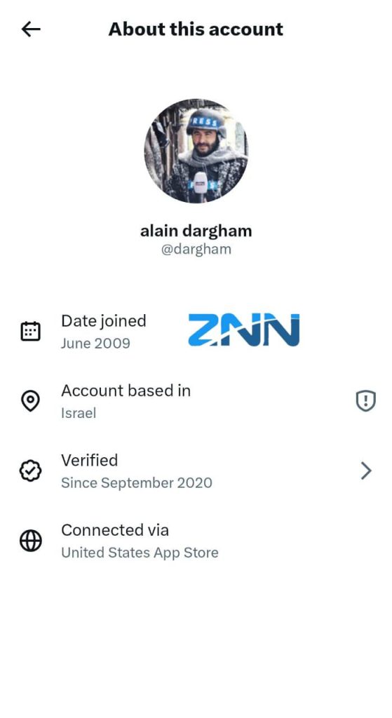 أثار ظهور موقع حساب مراسل الـ”mtv” الصحافي Alain Dargham على منصة X على أنه “Based in Israel” حالة من الاستغراب والتساؤلات بين المتابعين.