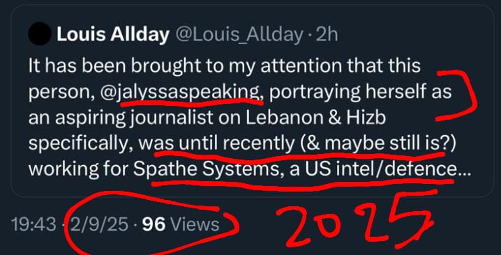 كشفت حاطوم أن المدعوة “جاليسا” لا تملك أي خبرة صحفية سابقة، وقد ادّعت منذ عام ونصف رغبتها في التثقف حول شؤون المقاومة، ليتبين لاحقاً أنها تعمل لدى شركة “Spathe Systems” المرتبطة بقطاع الدفاع والتجسس في أميركا حتى عام 2025.