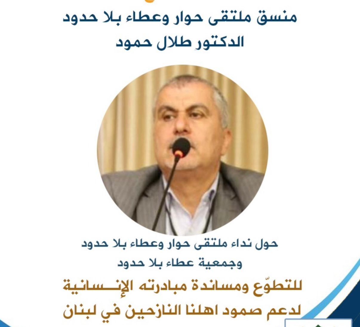 لذلك، أخاطبكم باسمي وباسم الهيئتين الإداريتين لملتقى حوار وعطاء بلا حدود وجمعية عطاء بلا حدود، متوجّهًا إلى جميع أصحاب الأيادي البيضاء، والمقتدرين، والمغتربين، وأصحاب القلوب الرحيمة والثروات، مهما كان حجمها: