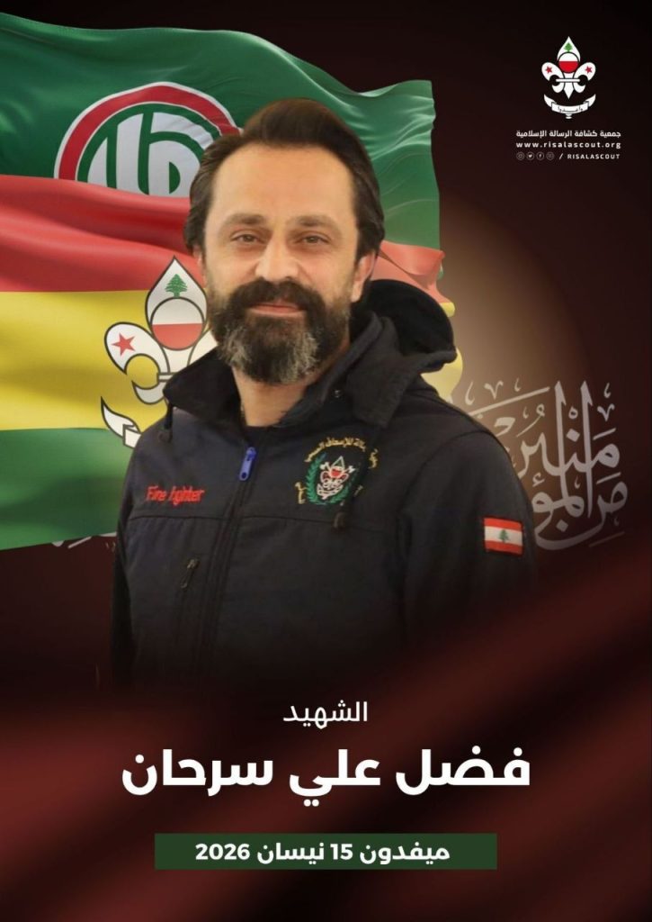 نعت جمعية كشافة الرسالة الإسلامية الشهيد فضل علي سرحان، من مواليد بلدة ميفدون بتاريخ 27 شباط 1983، والذي ارتقى شهيدًا أثناء قيامه بواجبه الإنساني، وذلك إثر الغارة العدوانية التي استهدفت بلدة ميفدون بتاريخ 15 نيسان 2026.