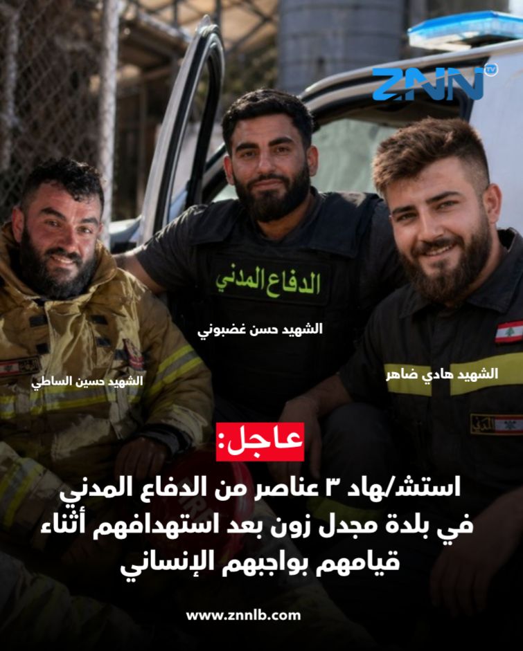 تنعي المديرية العامة للدفاع المدني ثلاثة من عناصرها الذين استشهدوا بتاريخ 28-04-2026، جراء العدوان الإسرائيلي على بلدة مجدل زون – قضاء صور، أثناء قيامهم بواجبهم الإنساني في تنفيذ مهمات الإنقاذ، وهم: